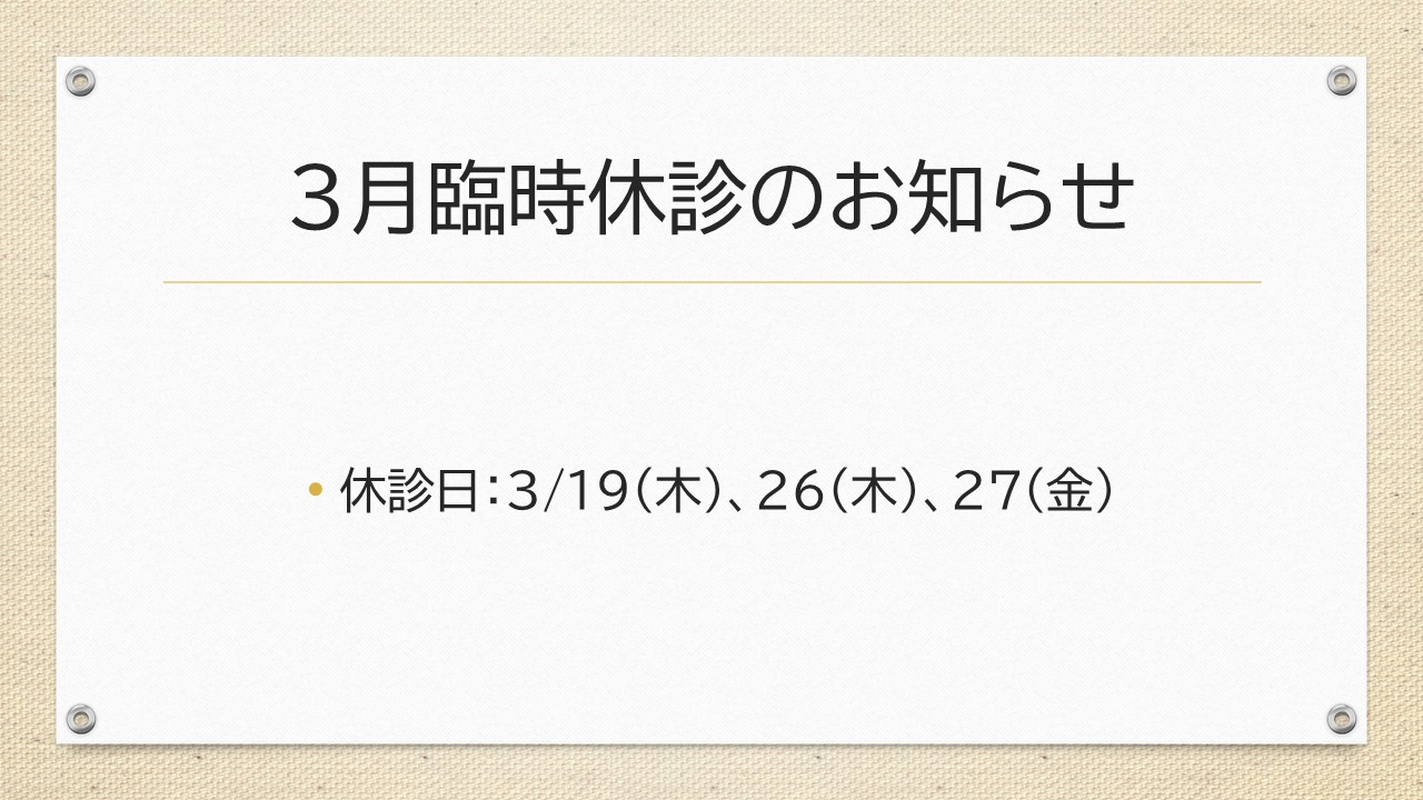 3月臨時休診のお知らせ 2026.02.16 いつもご利用ありがとうございます。 学校行事等の都合により、以下の日程で休診させていただきます。 休診日 3/19(木)、26(木)、27(金) なお、3月は祝日開院日はございません。 ご迷惑をおかけいたしますが、ご理解の程よろしくお願い申し上げます。 ブログ一覧へ戻る